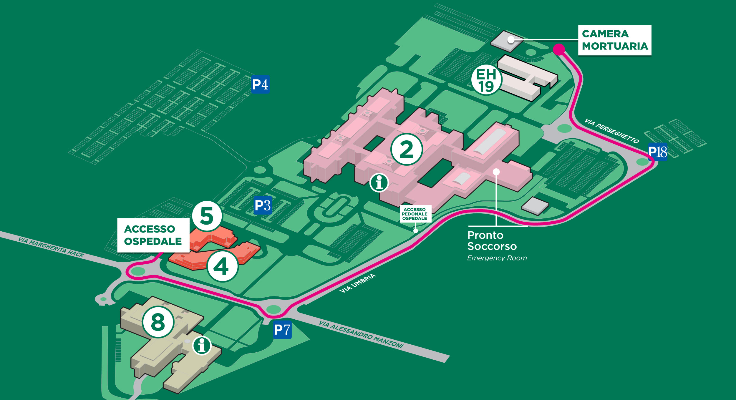 La Camera Mortuaria è sita in Strada Comunale Cascina Perseghetto, 16/A ed è raggiungibile dall’ospedale seguendo le indicazioni di seguito riportate.